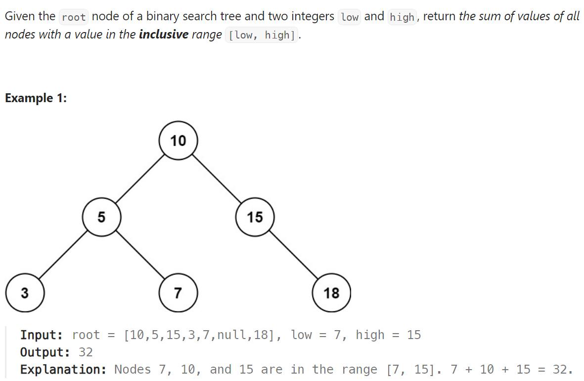 leetcode.com 938. Range Sum of BSThttps://leetcode.com/problems/range-sum-of-bst/description/ 이진 검색 트리의 범위 합 이진 검색 트리의 루트 노드와 두 정수 low와 high가 주어질 때, 값이 [low, high] 범위에 포함되는 모든 노드의 값의 합을 반환하세요. 풀이)이진 트리 사용트리 전체를 순회하면서 val이 low, high의 사이 값인 경우 저장해서 sum을 구함class Solution: def rangeSumBST(self, root: Optional[TreeNode], low: int, high: int) -> int: res = [] def traversa..